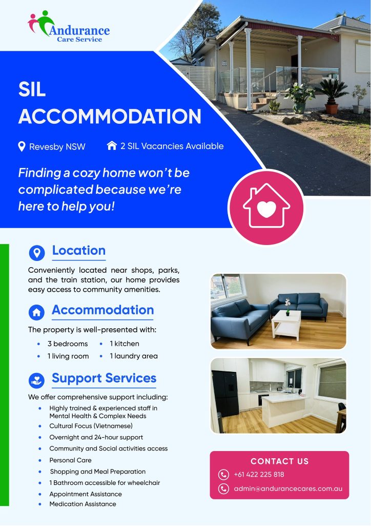 Liên hệ đội ngũ thân thiện của Andurance Care Service ngay hôm nay để tìm hiểu thêm về các vị trí SIL còn trống của chúng tôi (bao gồm cả ngôi nhà mới xinh đẹp của chúng tôi ở Revesby!) và cách chúng tôi có thể hỗ trợ hành trình NDIS của bạn.